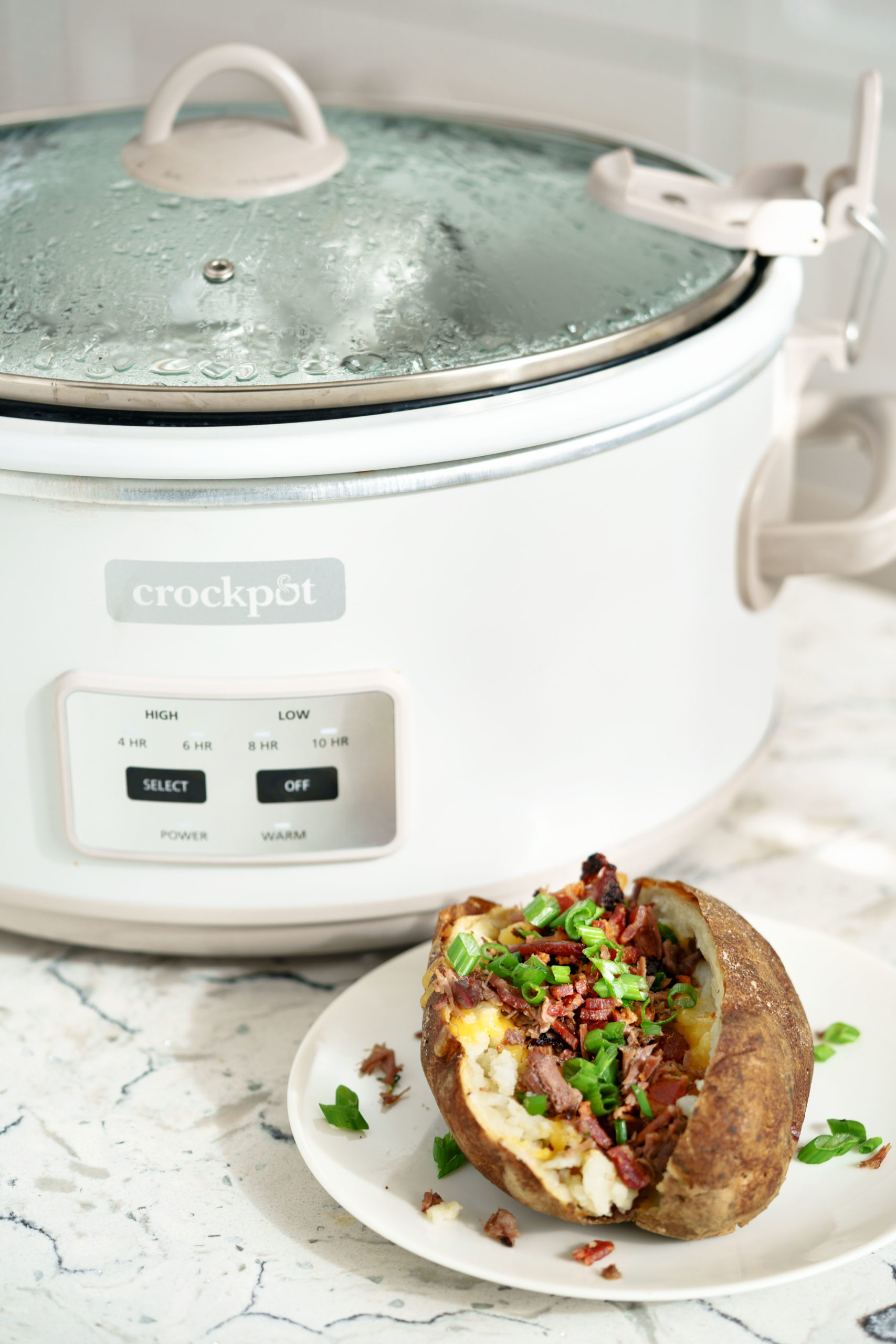 And if we go over the set time on the Crockpot ™ Design Series®, it automatically flips over to the warm setting so nothing ever gets overcooked. Of course the 7-quart capacity means I can easily place 6 large russet potatoes in it for baking.