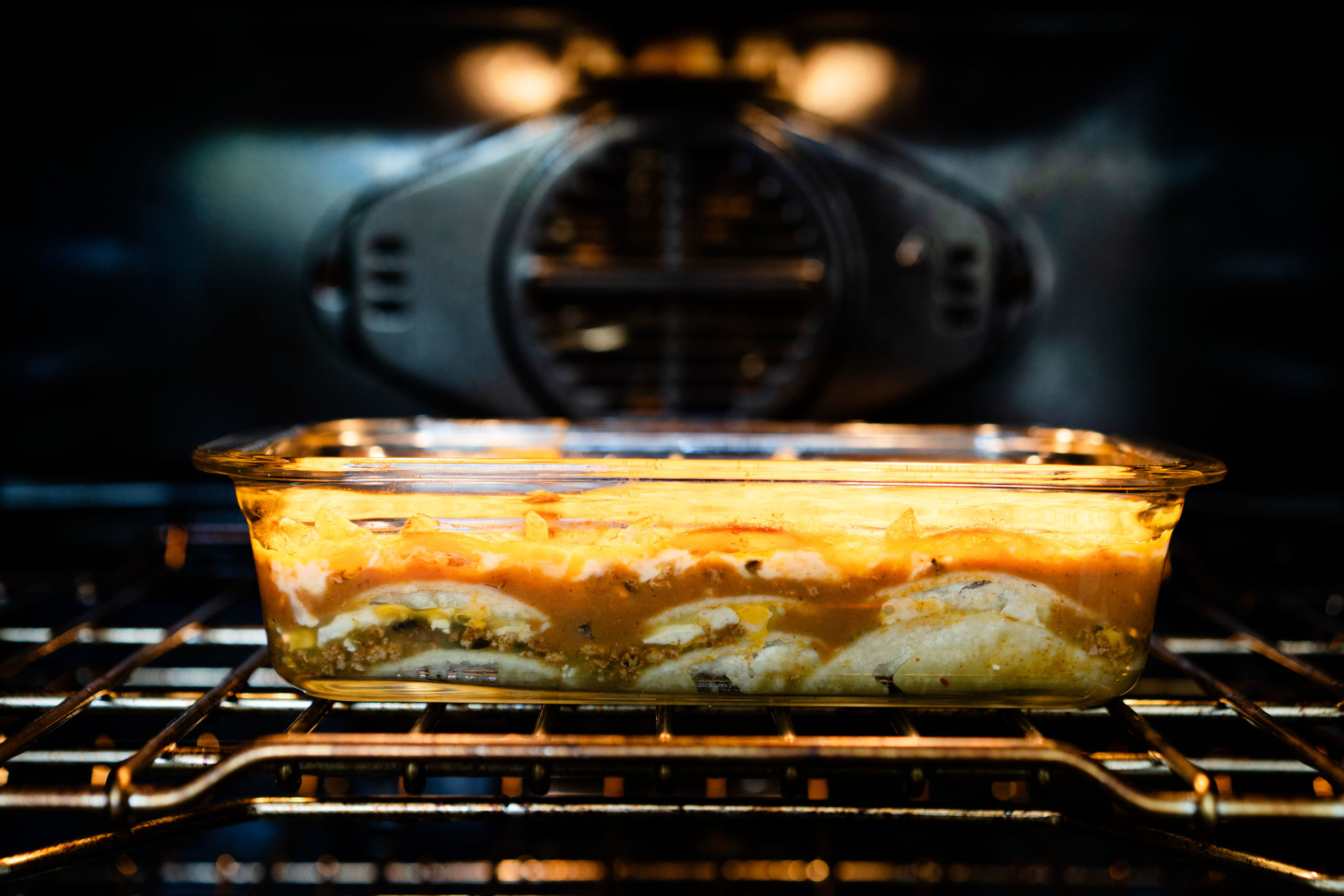 To bake, remove cover and place fully assembled lasagna pan into the oven (let pan come to temperature with the oven). Heat oven to 350 degrees F. Bake for 20 to 25 minutes or until lasagna is heated all the way through.