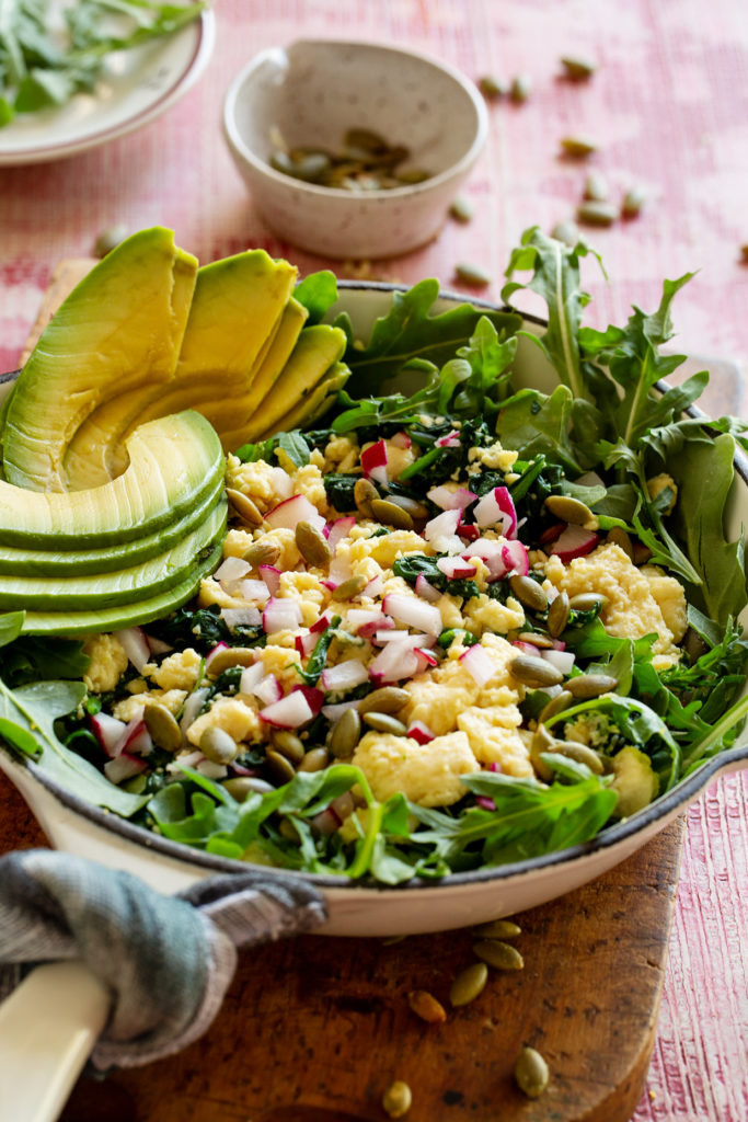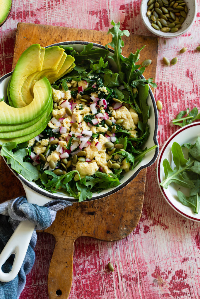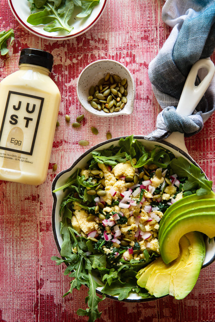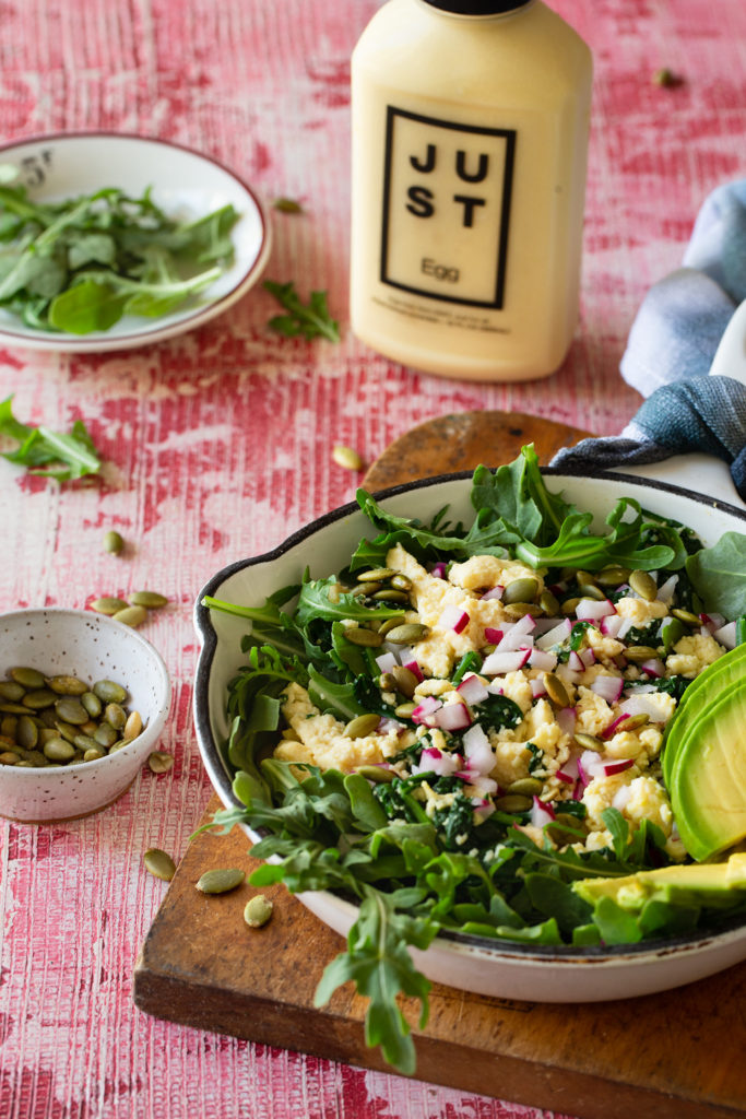 - Add Just Egg, stir slowly with a rubber spatula. Continue to stir until large curds begin to form, then fold the curds in the pan until no more liquid is visible. Season with salt and pepper. Remove from heat and serve over arugula and top with avocado and pumpkin seeds.