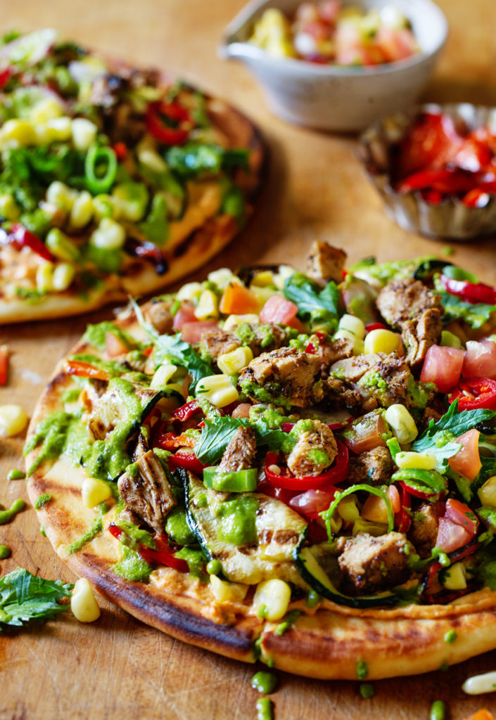 - To assemble: Evenly divide and spread red pepper hummus on to grilled pita flatbread. Layer with zucchinni, grilled chicken, corn relish, radishes, arugula, jalapenos and drizzle green harissa on top.