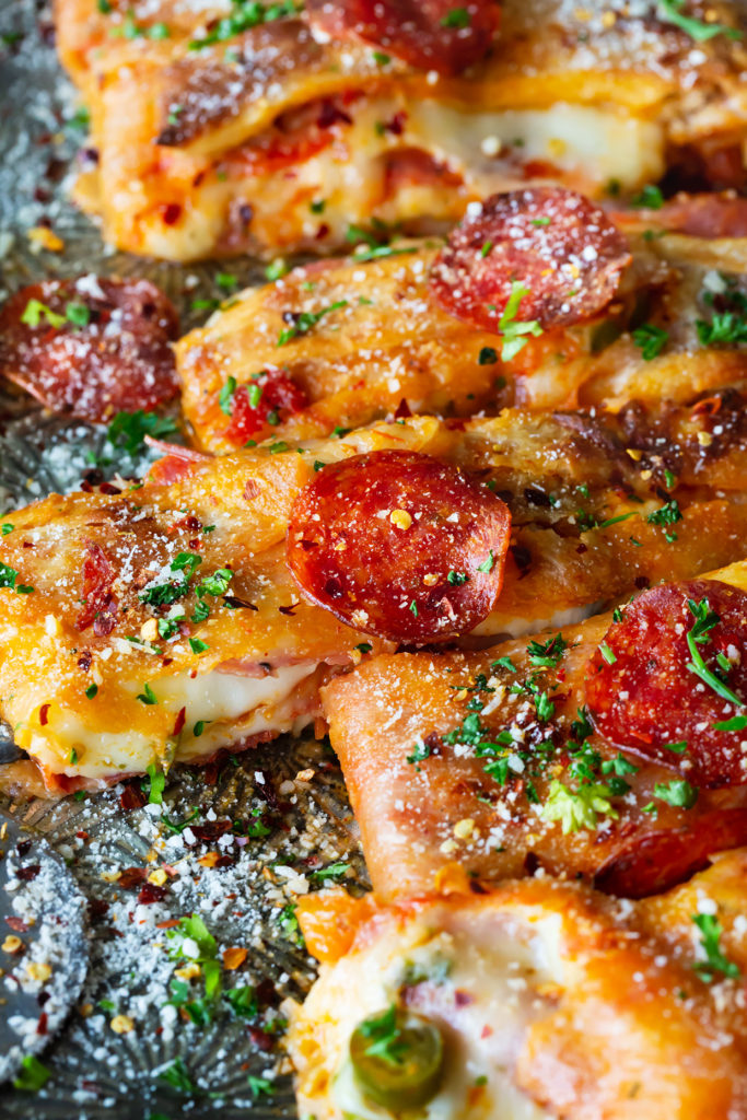 - Top with parmesan cheese, parsley and red pepper flakes.