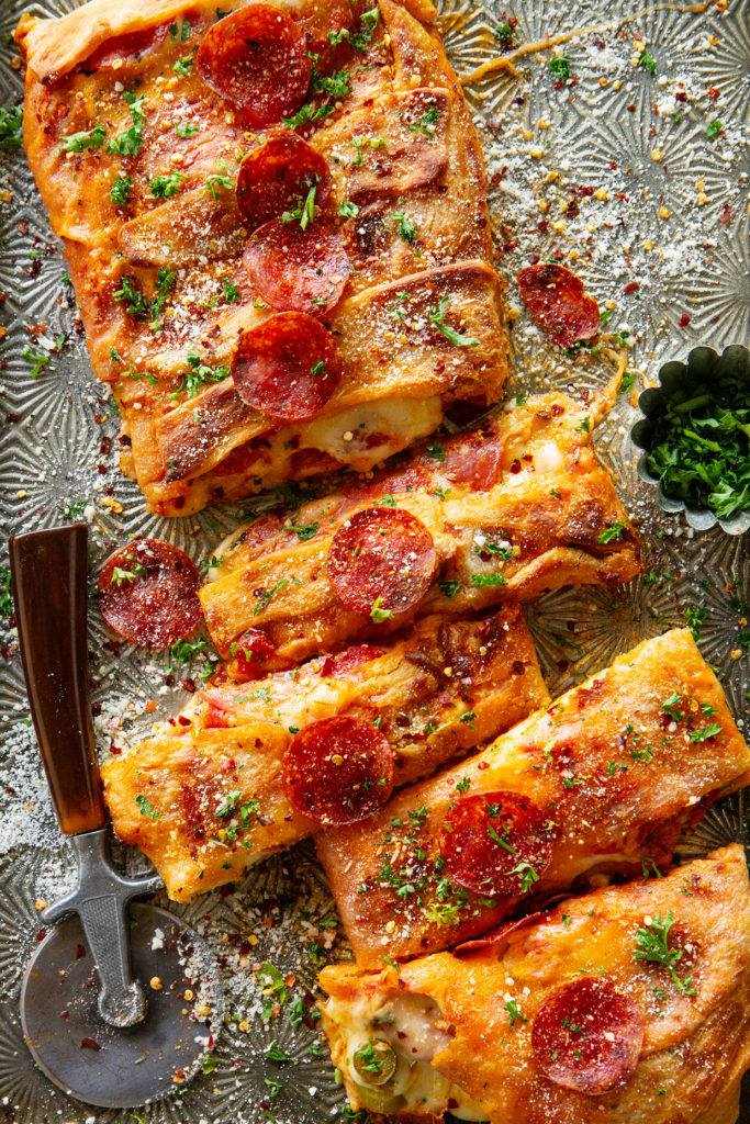 - Starting on the long end nearest you, roll it towards the other end. Make sure you finish with the seam side down. (Optional: Finish top side with a row of pepperoni.)