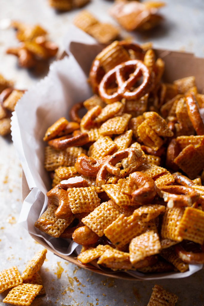 Sweet and Spicy Maple Bacon Chex Mix – Meet your newest snackable bite that’s a blend of sweet and spicy with a heavy hit of maple bacon. Gather the ingredients and fire up the oven because if you want to know how long to bake this Chex mix for, it’s only 20 to 25 minutes—that’s 30 minutes give or a take a few minutes to pull this together from start to finish.