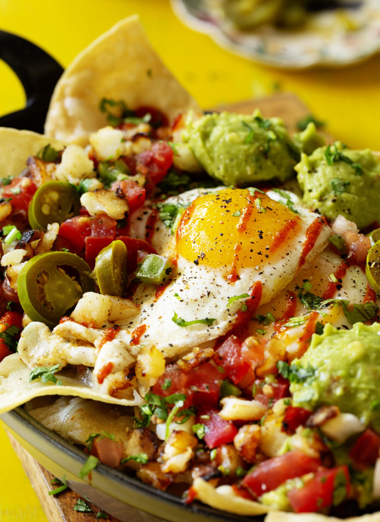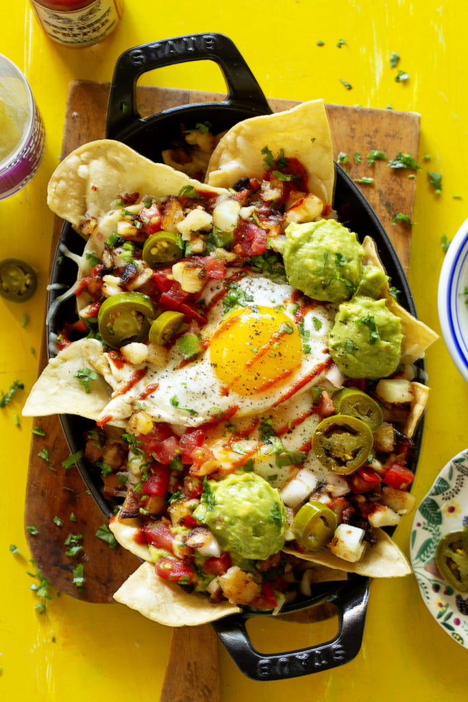 I’m totally stretching the standard breakfast with this one, but I see eggs, avocado, breakfast potatoes and chopped grilled chicken (dinner leftovers)— legit breakfast components that are nestled in copious amounts of cheese layered between tortilla chips. Who is going to say no to that?