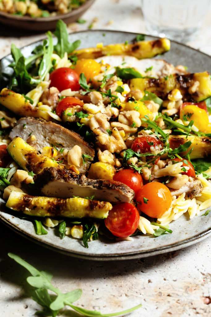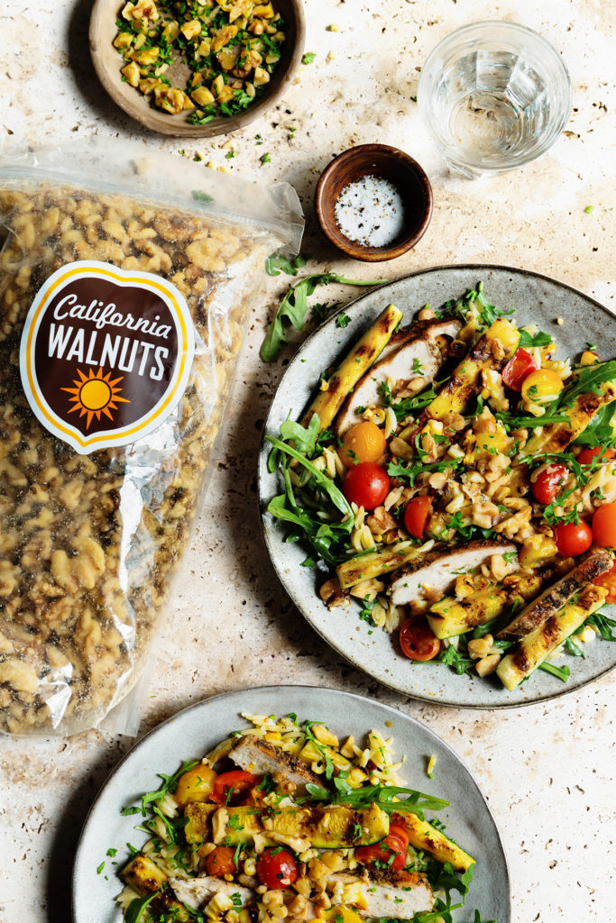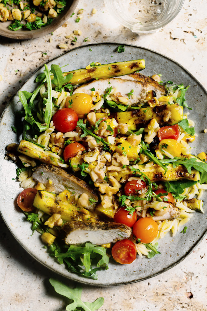 Grilled Chicken and Veggie Orzo Salad with Toasted Walnuts