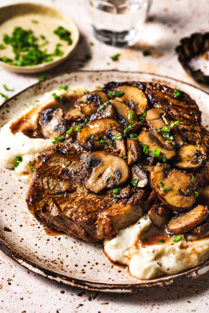 Grilled Rib-Eye Steak with Mushrooms and Cauli-Mash