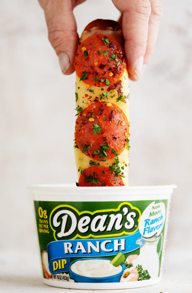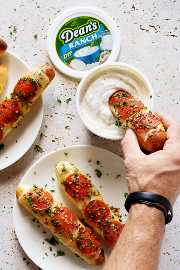 Heat oven to 400 degrees F. Place breadsticks on a baking sheet. Layer with cheese and pepperoni. Transfer to the oven and bake for 8-10 minutes. Top with red crushed pepper and chopped parsley. Remove from the oven and serve with Dean’s Dip Ranch Dip.
