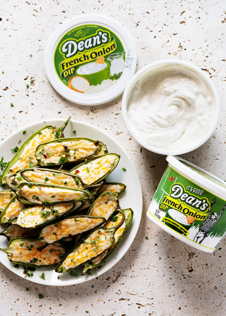 Heat oven to 400 degrees F. Halve jalapeños and remove seeds; set aside. In a large bowl, mix together cream cheese, cheddar cheese and Dean’s Dip French Onion Dip until well blended. Transfer filling to a plastic bag and snip of the one quarter. Squeeze filling into hallowed out jalapeños. Place on a baking sheet. Repeat until all jalapeños are filled. Place baking sheet in the oven and let bake for 10-13 minutes. Remove from the oven and serve with Dean’s Dip French Onion Dip.