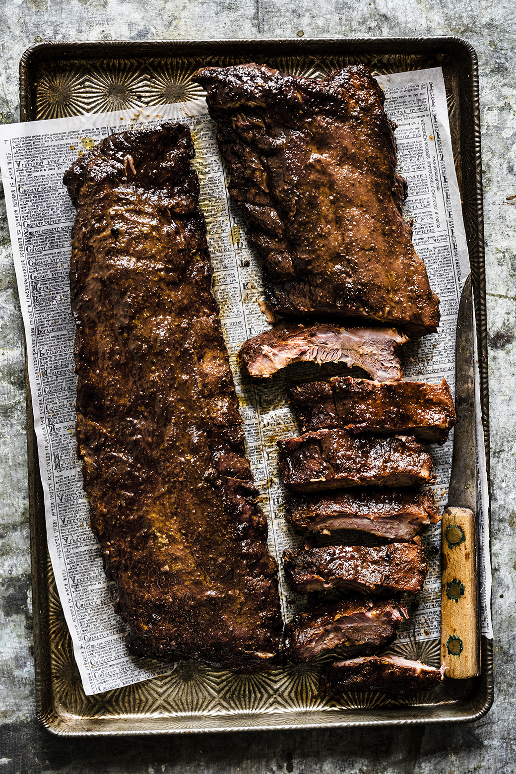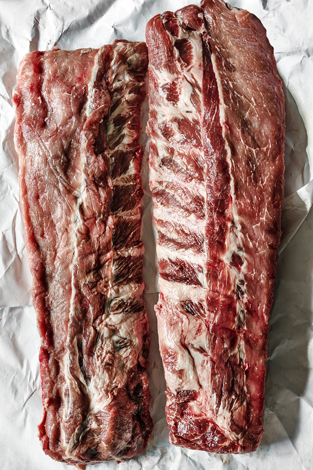Trim the ribs by placing the rack on a cutting board with the bottom facing up. Starting at one corner, slip a dull knife under the membrane and carefully dig underneath to lift and loosen the membrane. Using a paper towel (because the membrane is slippery), begin pulling to remove it. (Small note: You can also request the butcher to do this.)