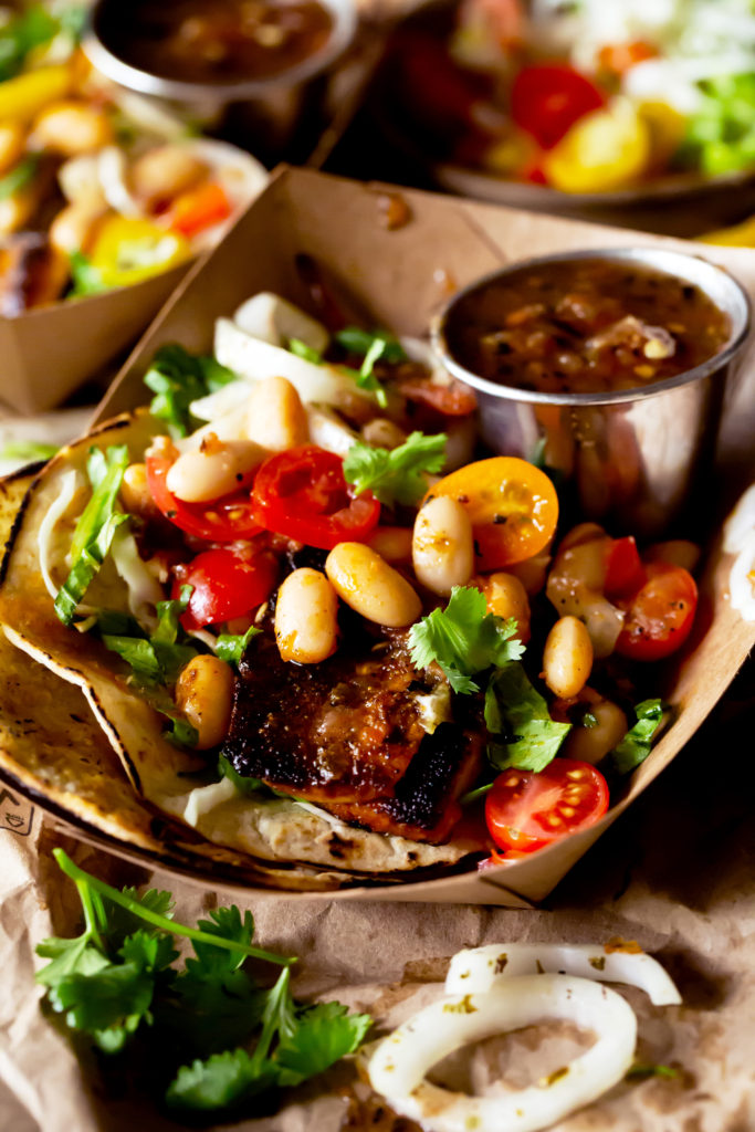 - I swapped out the pineapple salsa for a my tomato and bean relish