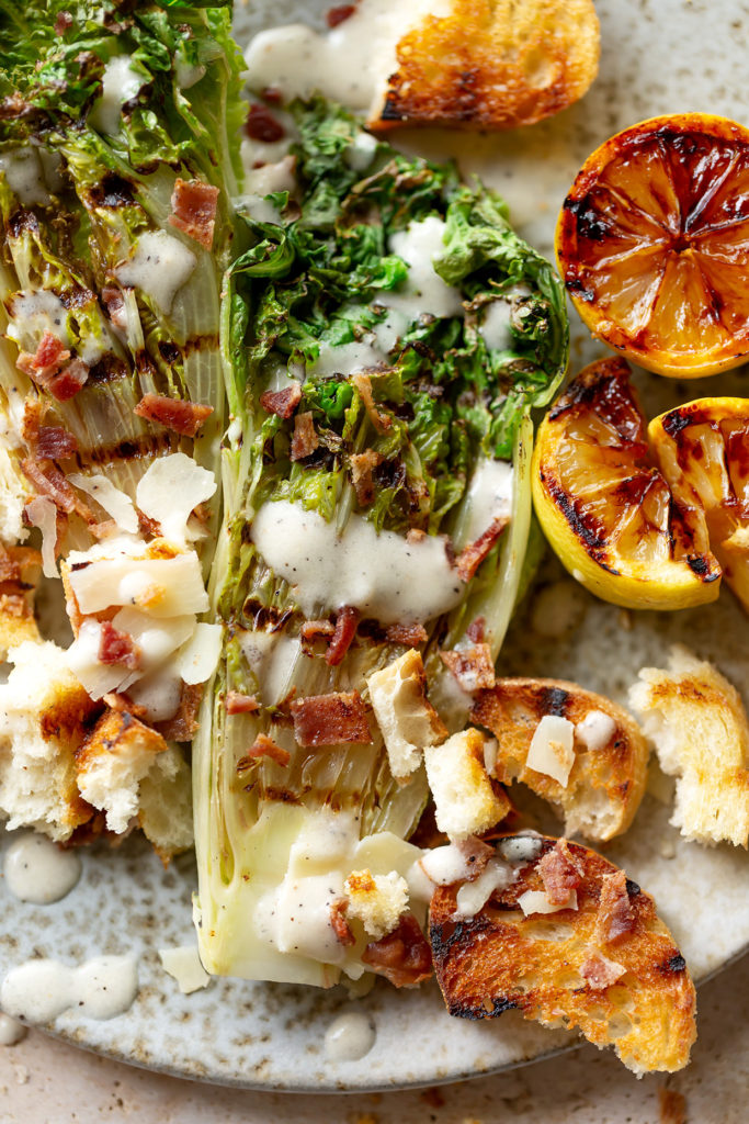 - Layer grilled romaine with torn pieces of the grilled baguette, Parmesan and bacon. Lightly squeeze charred lemons throughout, sprinkle with Parmesan cheese and drizzle Litehouse Organic Caesar dressing all over.
