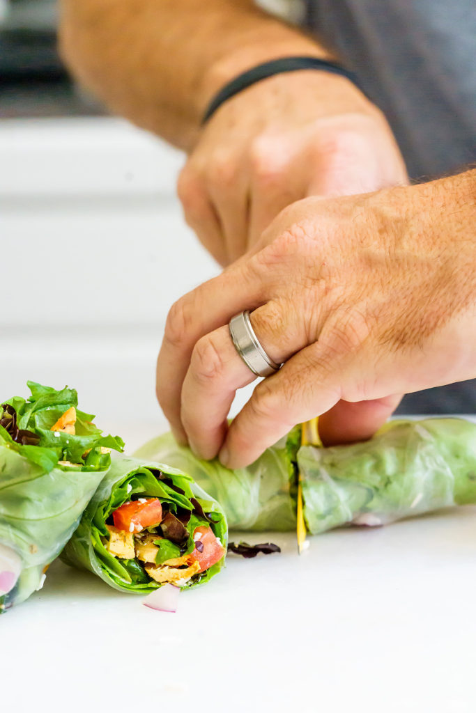 - Fill a pie pan with warm water. Submerge 1 rice paper into the hot water for about 2-4 seconds. Transfer wet rice paper on to a flat damp towel (flour sack towel works best). Lay one piece of butter leave lettuce down, leaving about 1/2-inch border all the way around. Spread 1 -2 tablespoons of hummus on top. Layer with salad mixture. Fold the bottom of the rice paper over the filling. Next fold both sides in towards the center. 3. Roll it up, while making sure that along the way, the filling is being tucked and pressed into a tight cyclinder. Cut in half if serving immediately. If lettuce rolls are being saved for a later time, wrap each one individually with plastic wrap.