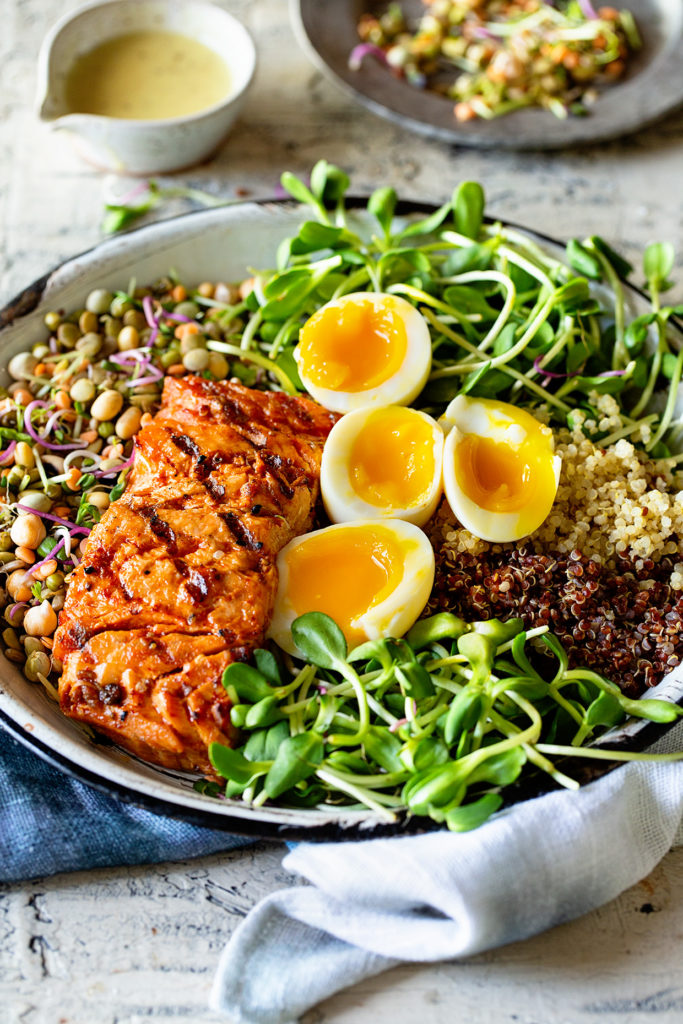 - Assemble the bowl by equally splitting the remaining ingredients into 4 separate portions. Halve the jammy eggs, and add them and, the grilled salmon filets to the bowl. Serve immediately with a lemon garlic vinaigrette or your preferred dressing.