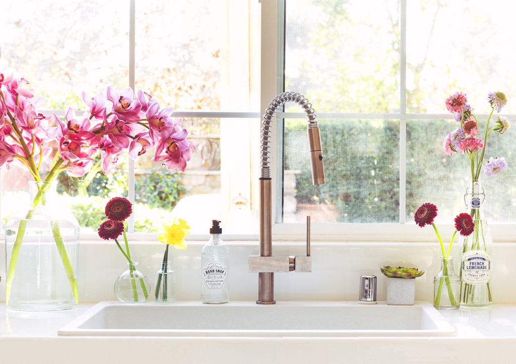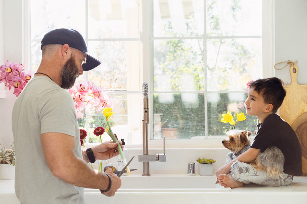 Naomi is big on flowers, so whether we are picking wild flowers or getting them from the flower market, they get rinsed and trimmed all in one place. The single bowl Quartz sink makes it so much easier. No more broken stems or petals and the Avado Single-Handle Pull-Down Sprayer Kitchen Faucet makes gentle rinsing a breeze.