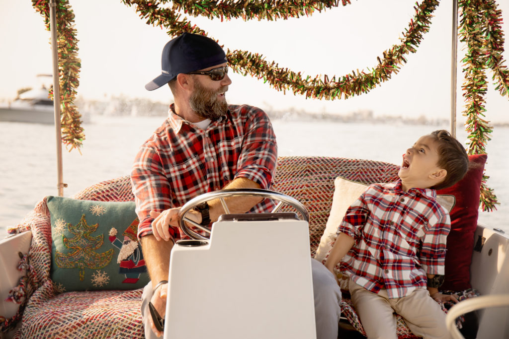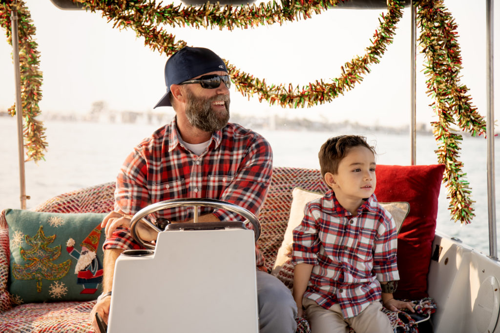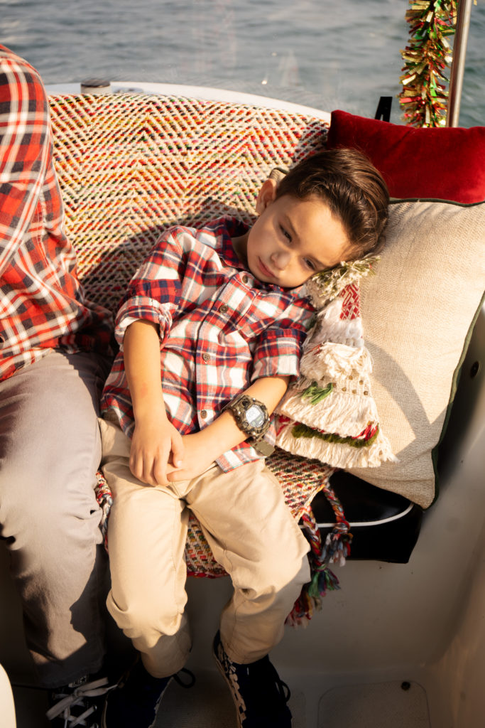 Of course he was overjoyed that we were going out on a boat. And then just as disappointed when he found it wasn’t a speed boat, but after letting him take the wheel for a little bit, he mellowed out. Nothing like handing control over to a toddler for a few minutes to keep a full-blown tantrum at bay. It took him all of three minutes after that to find his goofy side—of course, not without a little instigation from me—bring on all the holiday cheer!