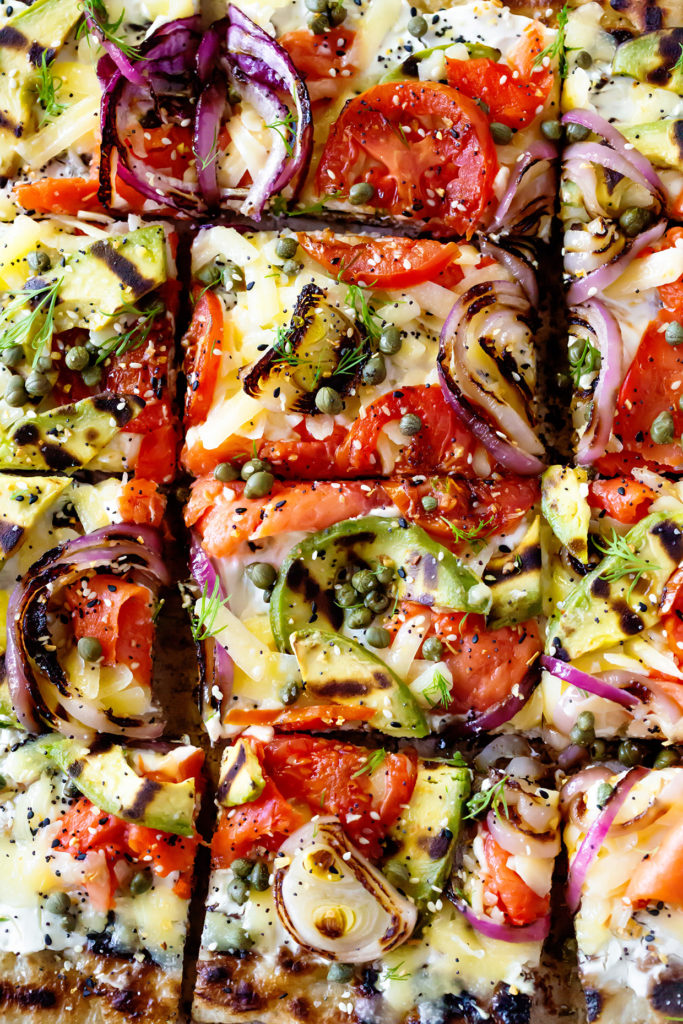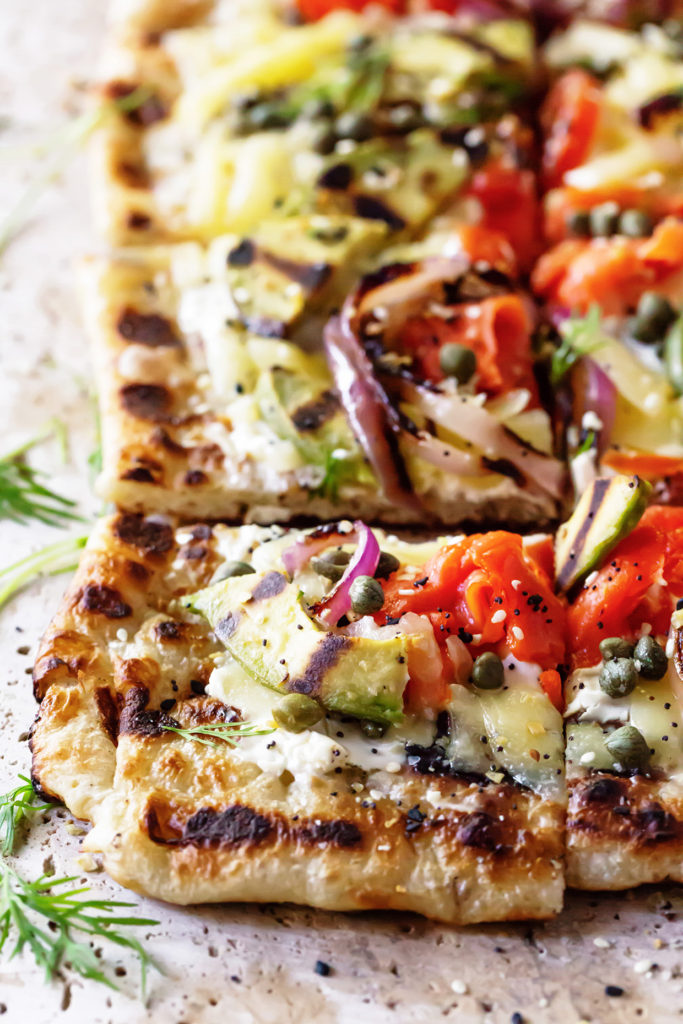 - Remove the crust from the grill to add the toppings. Spread cream cheese on top and layer with grilled onions, avocado, tomatoes, lox and cheese. If you the bottom of the crust is well browned, place a piece of foil the size of the pizza onto the grates (this will prevent the bottom of the pizza from further browning). Transfer topped pizza back to the grill and close the lid. At this point you are just melting the cheese. Remove pizza from the grill, top with capers, dill and everything bagel seasoning. Serve immediately.