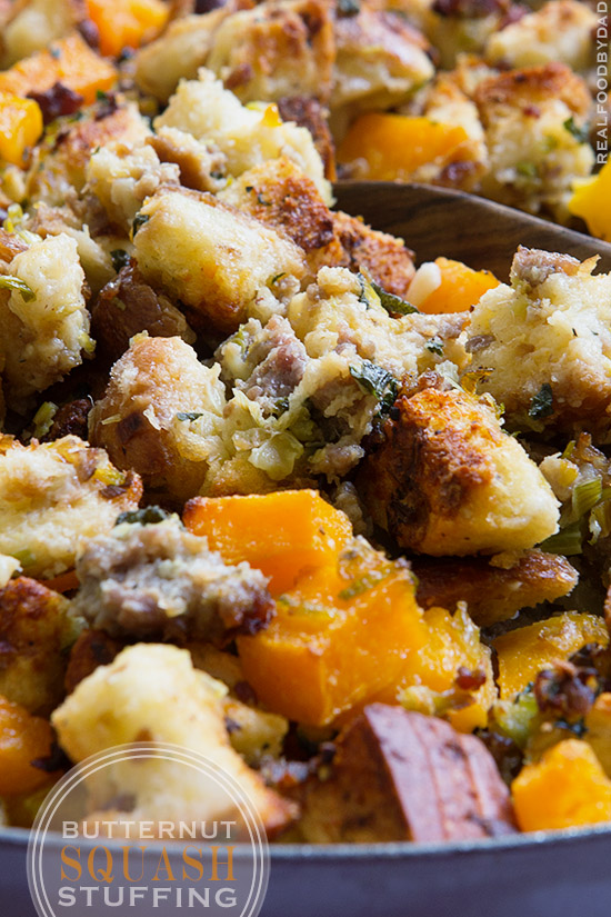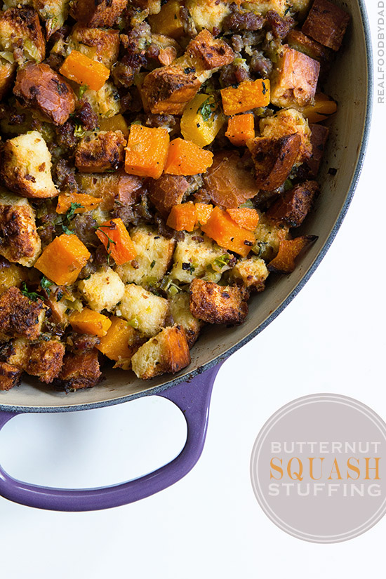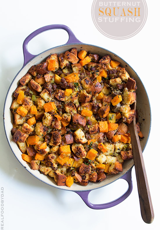 But when that time comes and I’m called to make something, this is what I’m making—this Butternut Squash and Sausage Stuffing. It’s awesome. Centered around a generous amount of rustic bread, it’s complimented by the sweetness of roasted butternut squash, which is the perfect offset to the rest of the savory ensemble.